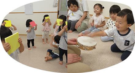 聴いて感じたことを自由に表現して遊ぶ、みんなの大好きな時間です。想像力のほか、注意して音を聴くことで集中力を高める、集団の中でのコミュニケーション力を育むなど、楽しい時間の中にたくさんの“ねらい”があります。音楽は情緒の安定にもつながると言われています。