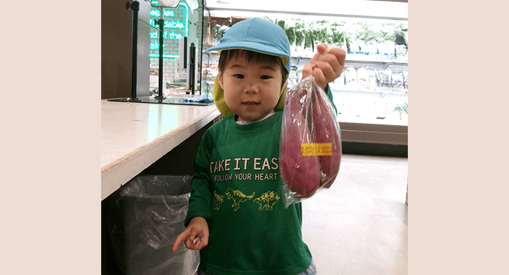 乳児期は、生涯にわたる食習慣の基礎を築く大切な時期です。八百屋さんにお買い物へ出かけ!野菜と親しむ食育活動を楽しみ!おいしい手作り給食で毎日おかわりしておなか一杯です!