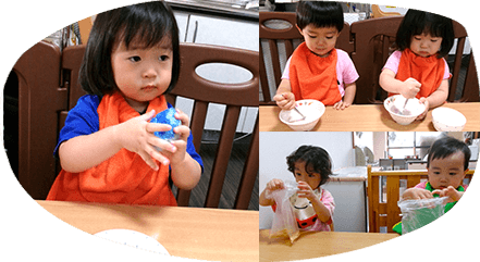 園庭で野菜を育てている他、毎月自分のおやつ作りにも挑戦しています。おにぎりを握ったりフルーチェを混ぜたり♪