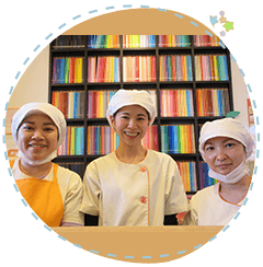 こどもたち、先生たちからの「おいしかった」の一言が聞きたくて厨房の職員一同で頑張っています。いろいろな食材を好き嫌いなく食べられるよう工夫しながら栄養満点のメニューをお届けします。離乳食も保護者の皆さんと話し合いながら無理なく進められるよう一人ひとりのこどもたちに寄り添って作っています。