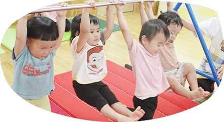 0歳児クラスの時から体幹を鍛える運動遊びをたくさん導入していきます。こどもたちは鉄棒や平均台、雲梯にも興味津々で楽しみながらいろいろチャレンジしてくれます。運動能力も上がり、感覚の統合を促します。危機回避能力も身に着けていきます。