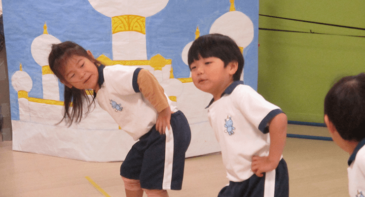 月に1回ネイティブの先生が来てくれています。耳から入る自然な英語に触れ、歌やダンスを楽しんでいます。