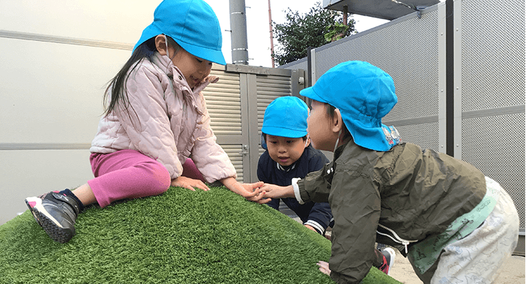 - 園庭の築山では、小さな子も大きな子も全身を使って楽しんでいます