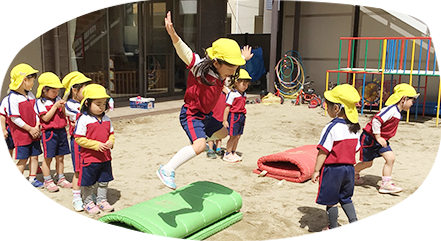 2歳児クラスよりこどもたちの発達に合わせ、鉄棒・マット・跳び箱などを使用し運動の基礎的能力を養っていきます。