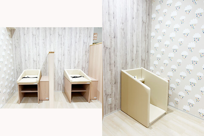 mamocco(まもっこ)では、赤ちゃんとのお出かけの際に欠かせないおむつ替えの場所を、施設内の必要な場所に複数設置しています。