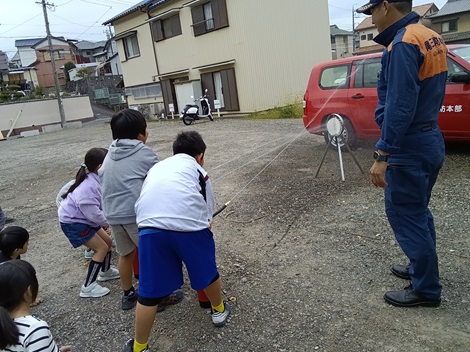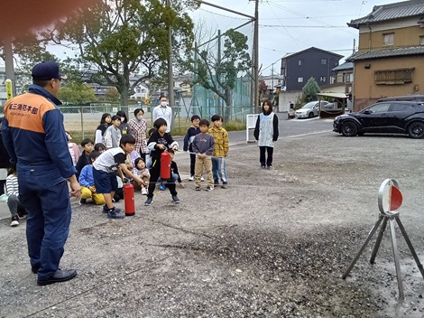 11月13日(木)PM3:20〜小学生対象に消火訓練を実施しました。豊明消防署員の方にお越し頂き、消火器の使い方や火災時に大切なことを教えて頂き、実際に水消火器を使用して、消火器の扱い方を学びました。実際の火災では、子どもが使用する機会は極めて低いとは思いますが、知っているといざという時に、役立つことが出てくるかもしれません。良い経験になってくれたら幸いです。