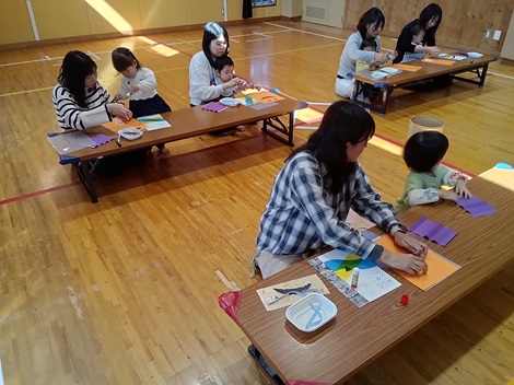 10月23日(木)AM10時30分〜カンガルー教室を実施しました。今回はハロウィンにちなみ、お菓子を入れたりできる手提げバッグ作りが、メインの活動でした。親子で一緒に作る様子が微笑ましく暖かい空気が流れているようでした。その他にも触れ合い遊びやバスタオルの体操等で親子のスキンシップを楽しんだ時間でした。