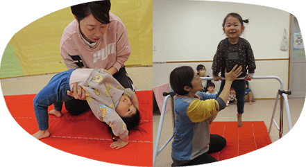 動物に変身したりマットやフープを使ったりして、楽しみながら這う・くぐる・ジャンプ・ぶら下がる・腕の力で進むなどの基本的な動作で体を動かしています。でんぐり返しやブリッジ、鉄棒にも挑戦しています。自分の身体の使いかたを知りながら体力をつけ、危険を回避できる力を養っていくことをねらいとしています。