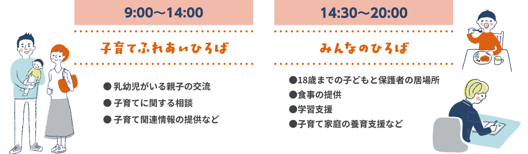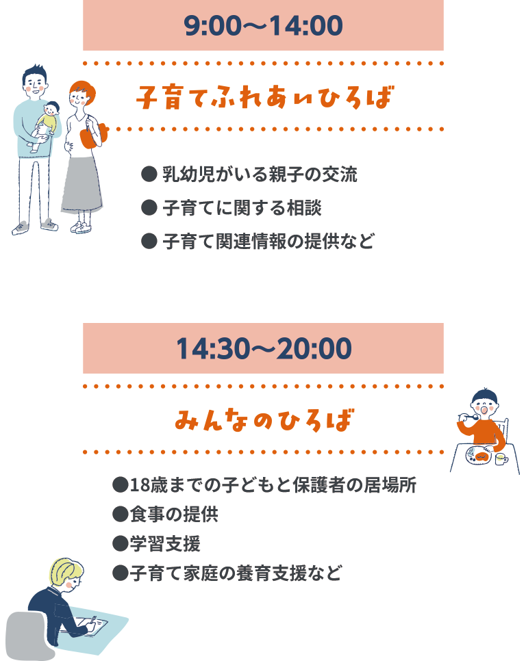 - 親へは子育ての学びや気付きの場、こどもたちへは学習や交流の場を提供します。