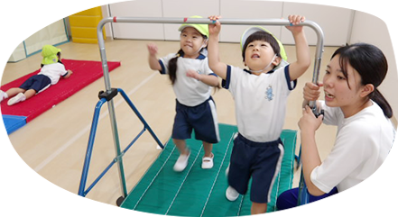 2歳児~対象。毎月2回水曜日に実施。コスモスポーツクラブの講師が指導を行います。鉄棒や跳び箱、マット運動など様々な運動をこどもたちに合わせた指導でたくさんの「できた!」を増やし、運動に対する自信を育みます。