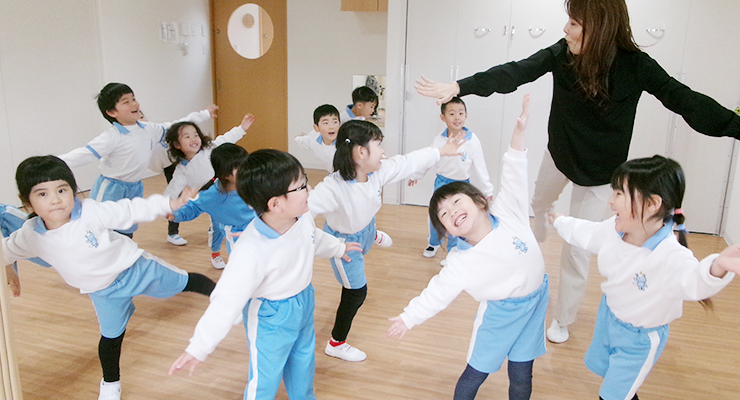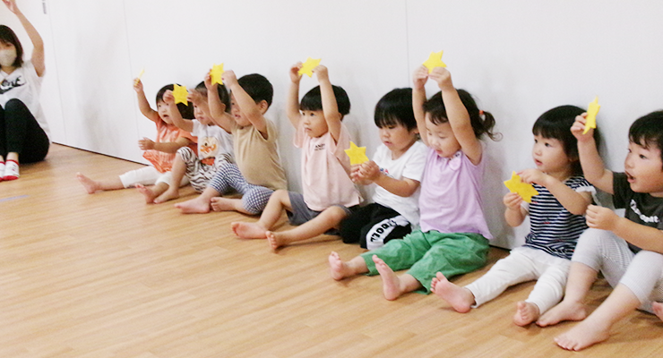 2歳~。リトミックHOPPEの先生に来ていただき、音楽に合わせて体を動かしています。
