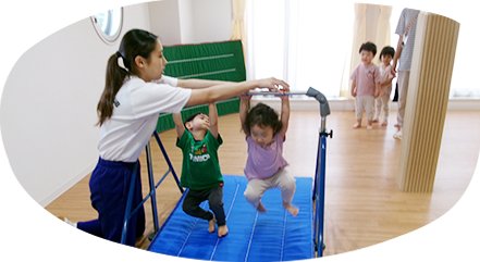 2歳~。週2回コスモスポーツクラブの先生が来てくれて鉄棒、跳び箱、マット運動の指導をしてくれています。基礎体力をつけながらこどもたちの「できた」を大切にして楽しく参加しています。希望者には課外クラブも実施しています。