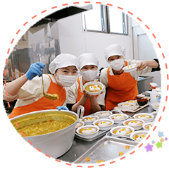 毎日こどもたちの「調理員さん‼たくさん食べたよ!!!」「おかわりしたよ!!!」の声に元気をもらいながら楽しく調理しています。楽しく、おいしく食べることは心の栄養になります。ていねいな給食・食育を通して食べることの大切さを伝えていきます。