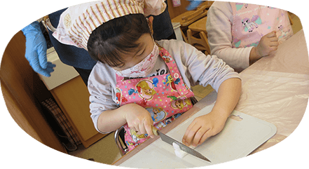 栄養士:毎日、安心安全で「おいしい!」と言ってもらえる給食を作る事を調理室一同心がけております。一人ひとりが食に興味を持ち「食の大切さ」を学べる食育を行なっていきたいと思います。