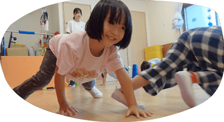 マット運動や跳び箱、鉄棒など・・・。全身を使って体を動かし、「できた!」という体験の中で、こどもの可能性を大いに引きだします。(幼児クラス)